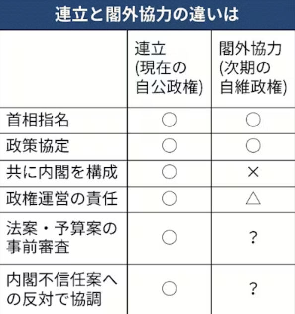 今回は、維新が「閣外協力(かくがいきょうりょく)」って形で参加。