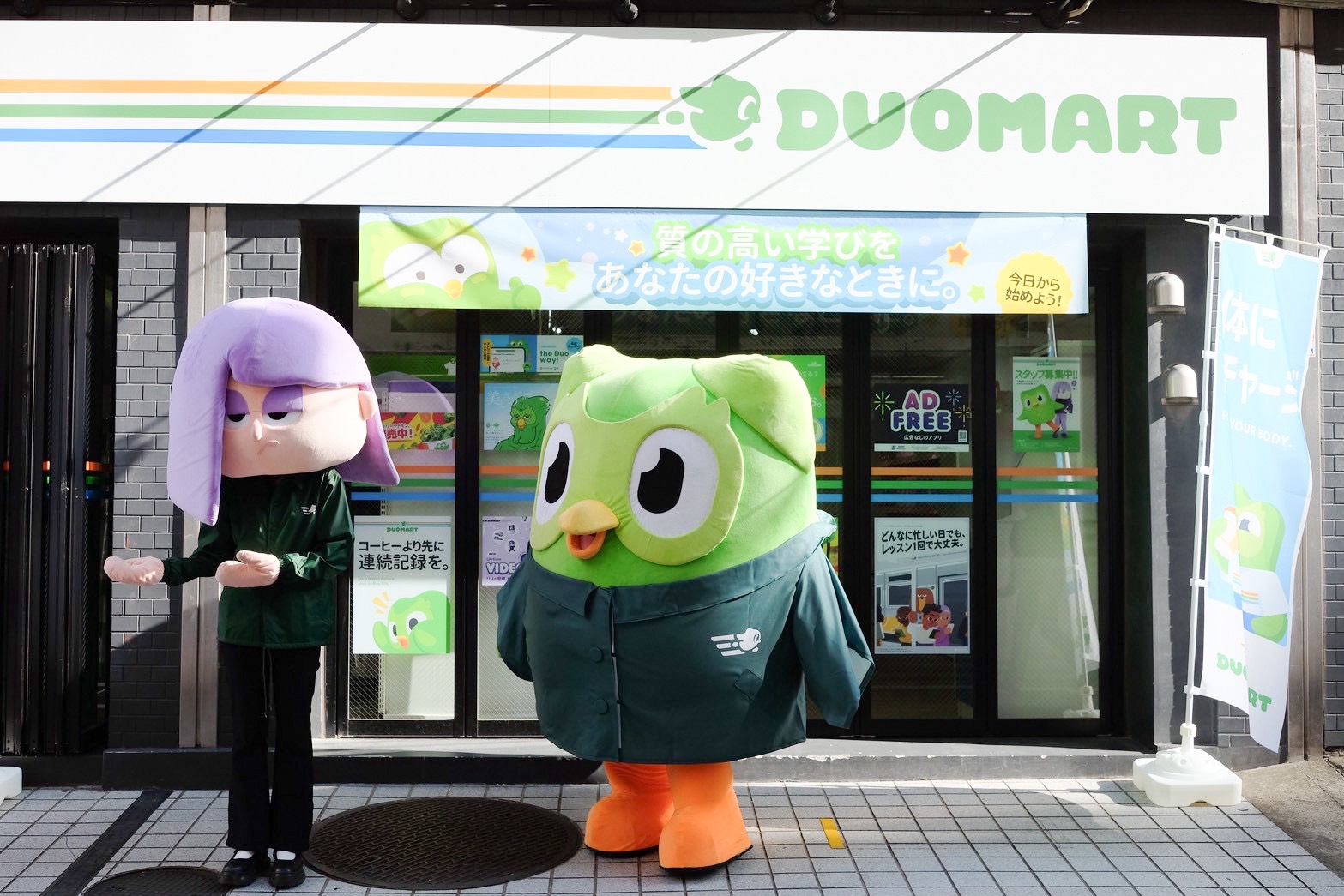 「いつでも学べるアプリ」と「いつでも立ち寄れるコンビニ」という共通点を掛け合わせ、Duolingoが“いつでもあなたのそばにいる存在”であることを表現!