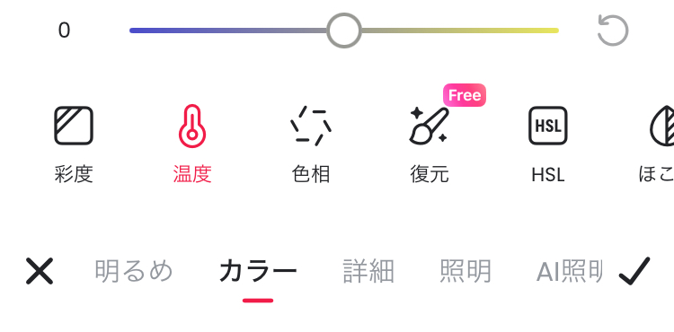 「明るめ」の横の「温度」を調節します!温度は写真の色味によって調節してるけど〜-20くらいが多いです!!めちゃくちゃ黄みがある写真とかだともっと高い数値まで下げる事もあります🥺❣️