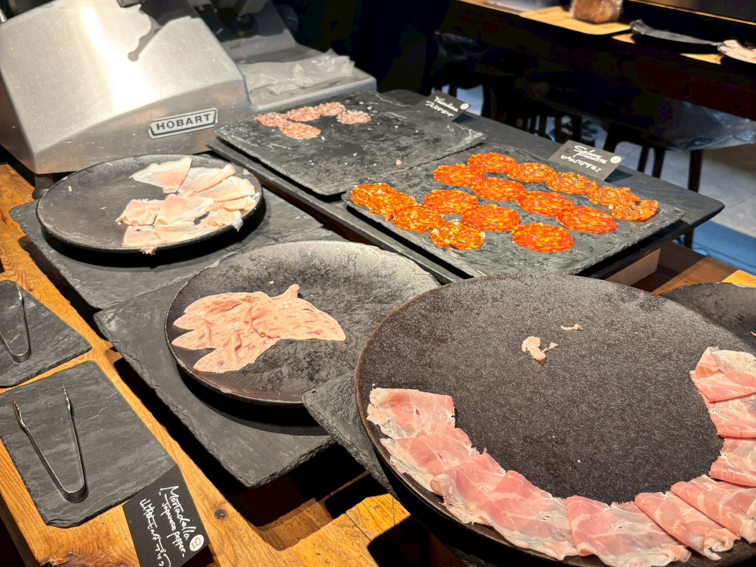 生ハムはその場で切り立てのものが食べられるので、しっとりとした食感と旨みがしっかり感じられます。真鯛のカルパッチョもとても美味しく、さっぱりしているのでパンとの相性も抜群でした♪
