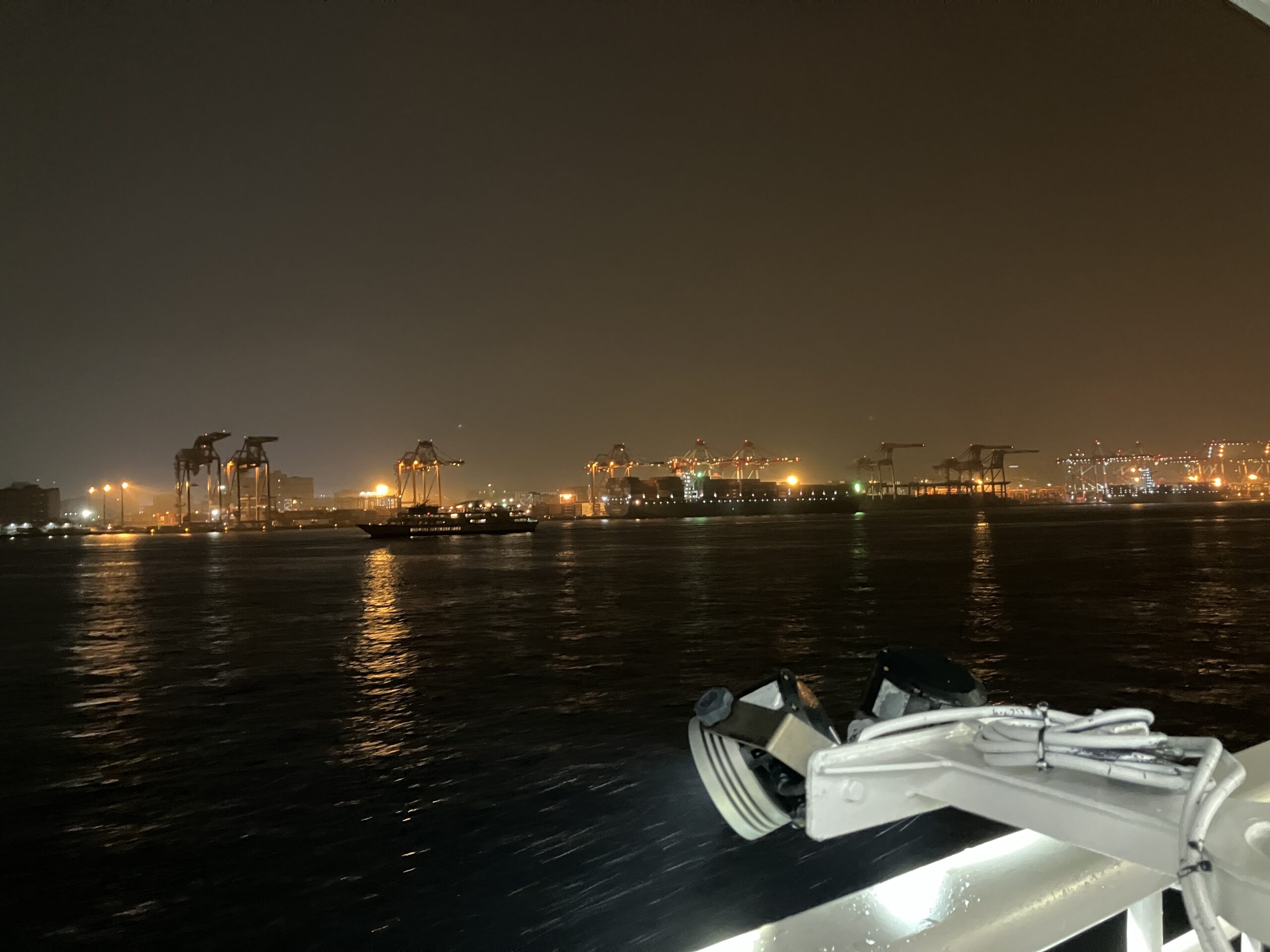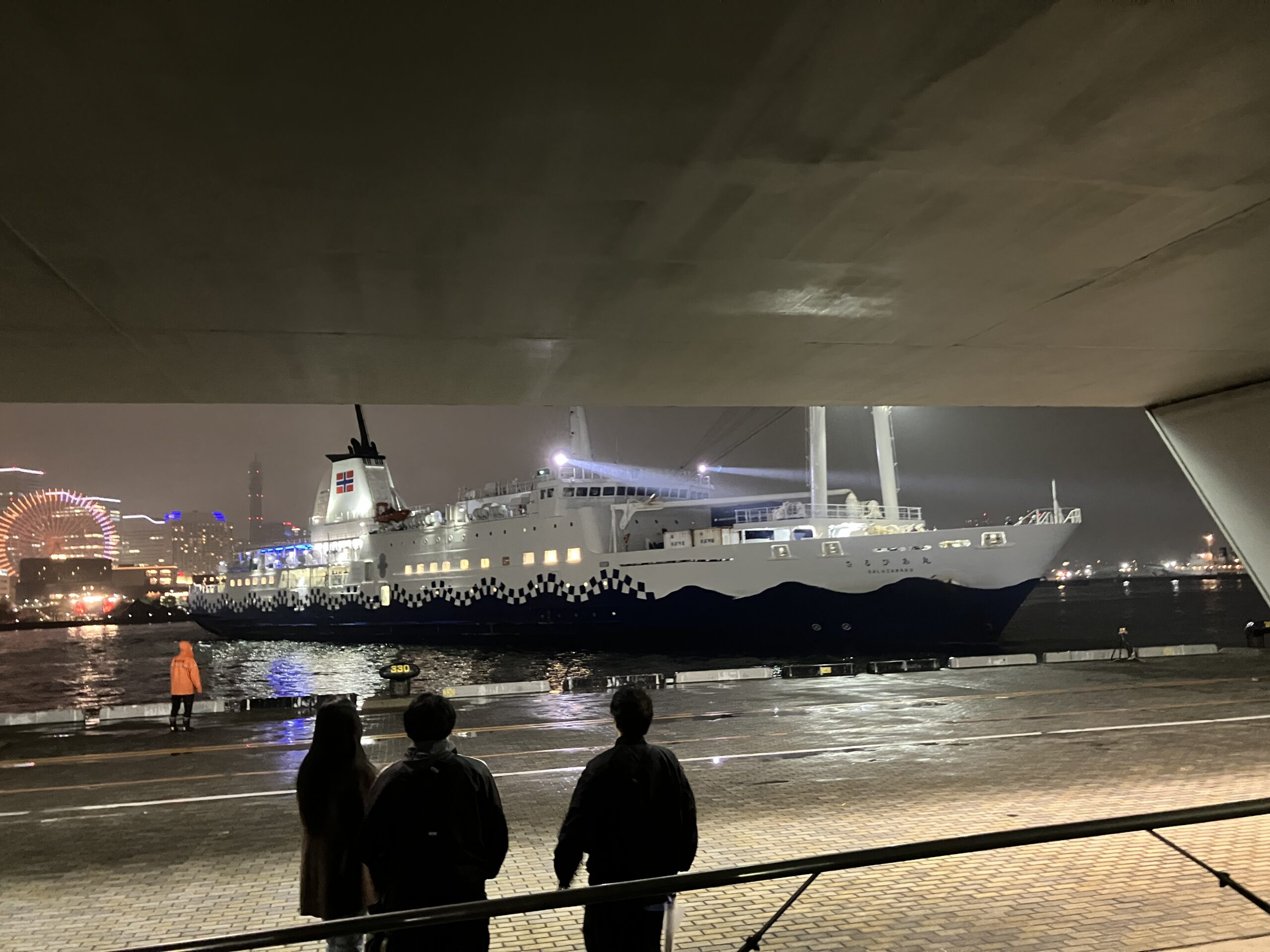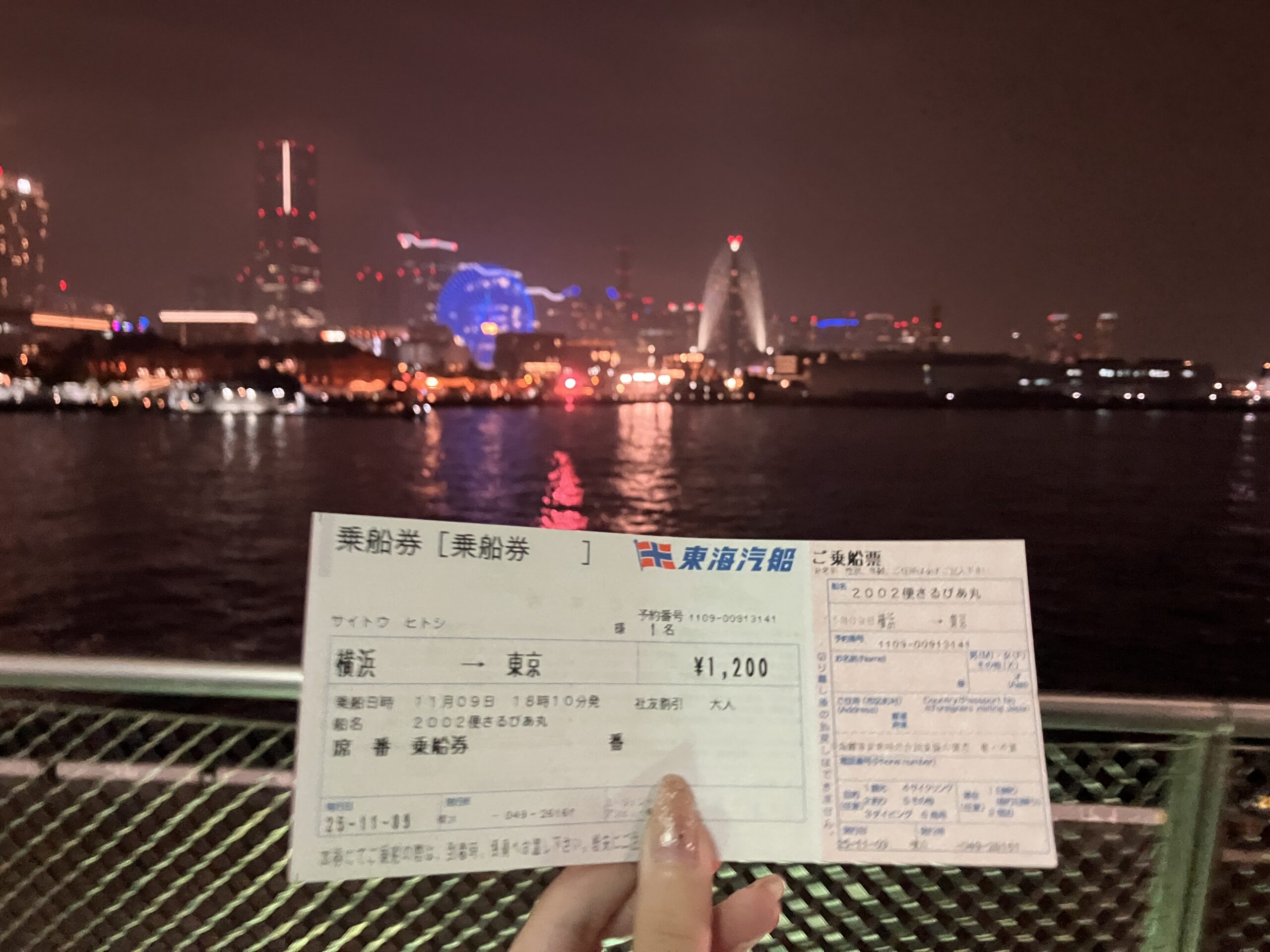 みんな夜景バックに写真撮りたいと思うんだけど、出発して少ししたら横浜の夜景をすぎて、そこから結構長い間真っ暗なので早めに撮っちゃうのがおすすめ!