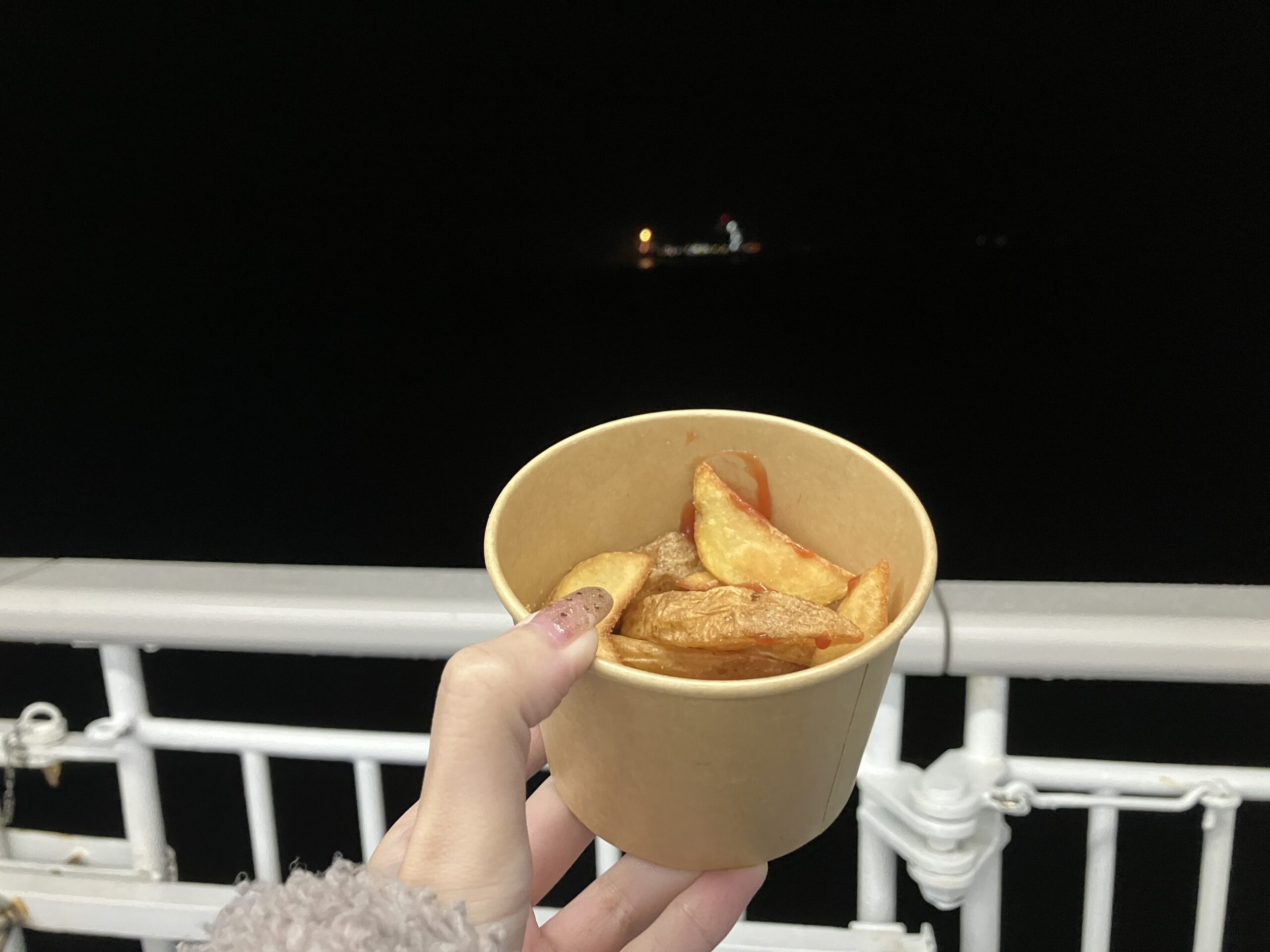 寒かったけど、大体の時間は展望デッキで過ごしたよ!6階の売店ではポテトとかドリンク・スープなどなど軽食が売ってて、ポテトを買ったよ!食べ始めた後に写真撮るの忘れた!!ってなって撮ったので、ほんとはもう少し入ってます!!笑