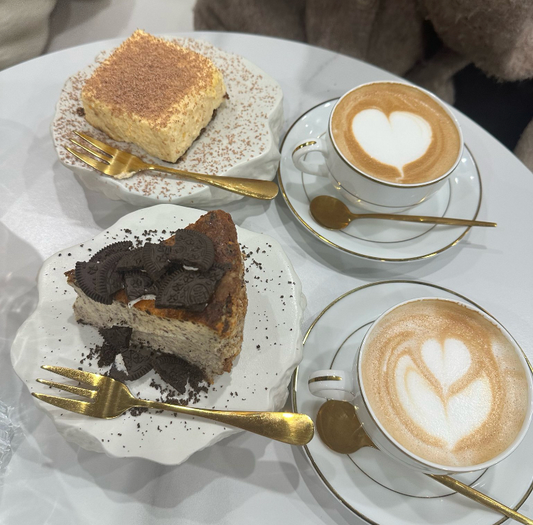オレオバスチーとティラミスを注文!カフェラテのラテアートがめっちゃ可愛い🫧