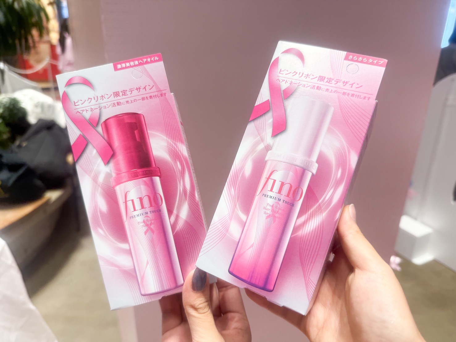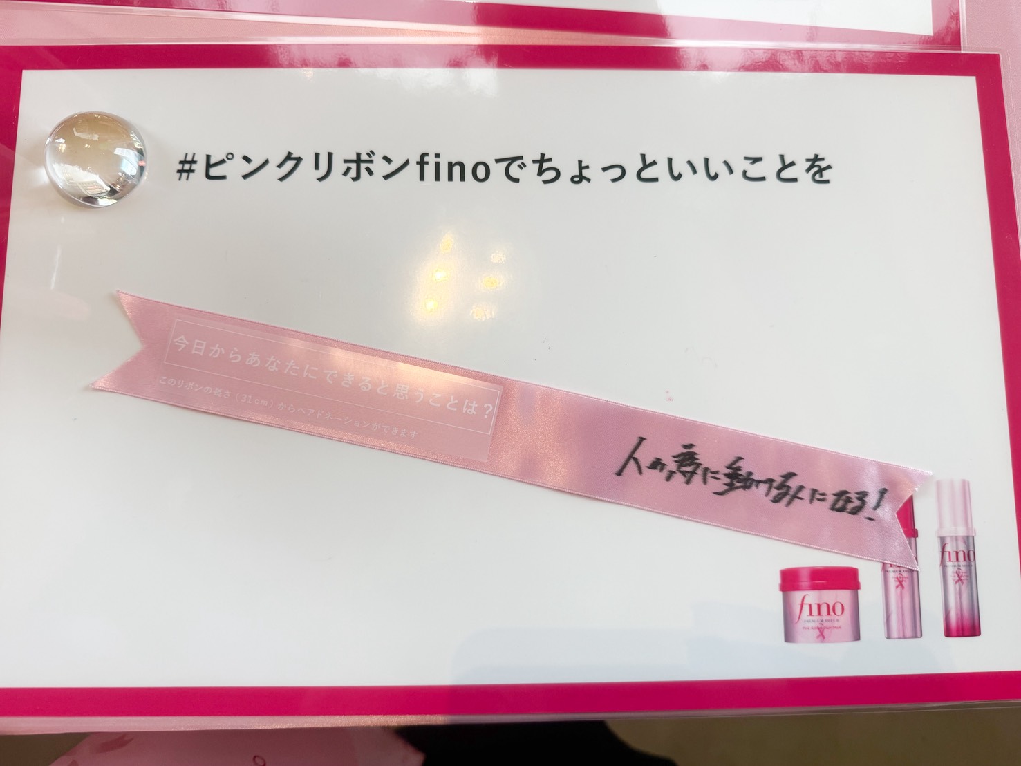 全体がピンクで彩られた店頭プラザ!今回のピンクリボン活動との協賛取り組みとしてフィーノから発売されている3商品がピンク色になっているの💗大きなパネルや現物も飾られていたよ!