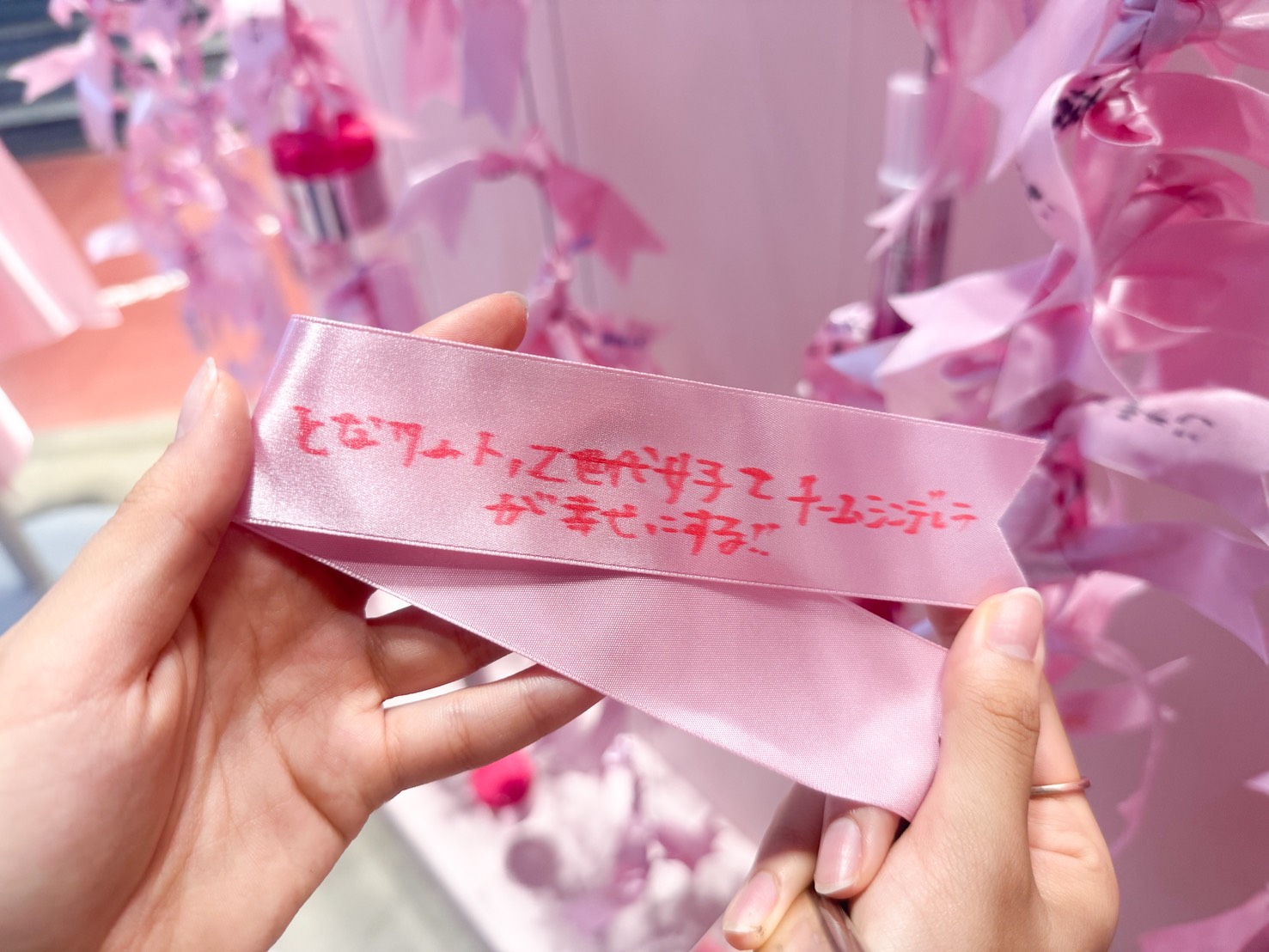 会場内には参加者がピンクリボンに「誰かのために今日からできること」を寄せ、結べる場所が設けられていたよ💟ピンクに溢れた空間は、まさに明るい未来を照らしているよう🌟