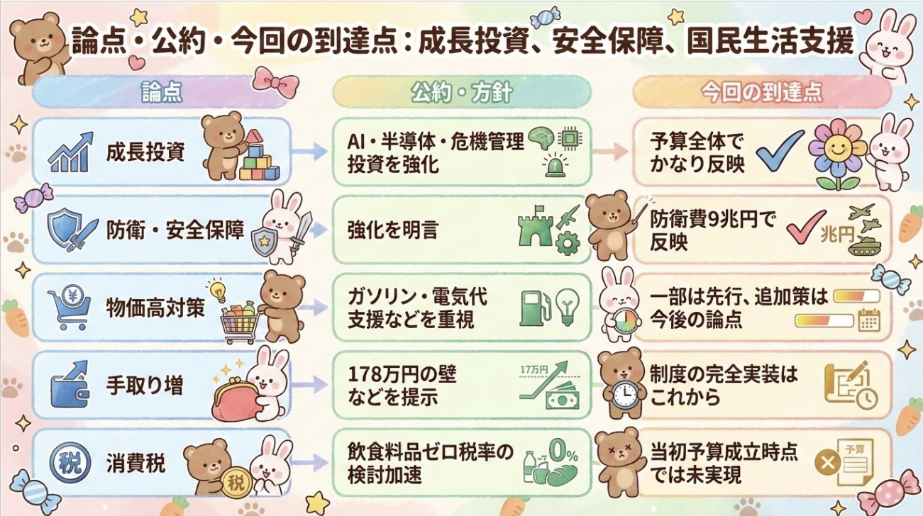 結論を言うと、高市政権は「成長と守り」にドーンとお金を使うことに決めた。でも、うちらが求める「手取りアップ」や「物価高対策」のフル実装は、ここからの動きしだいって感じ!