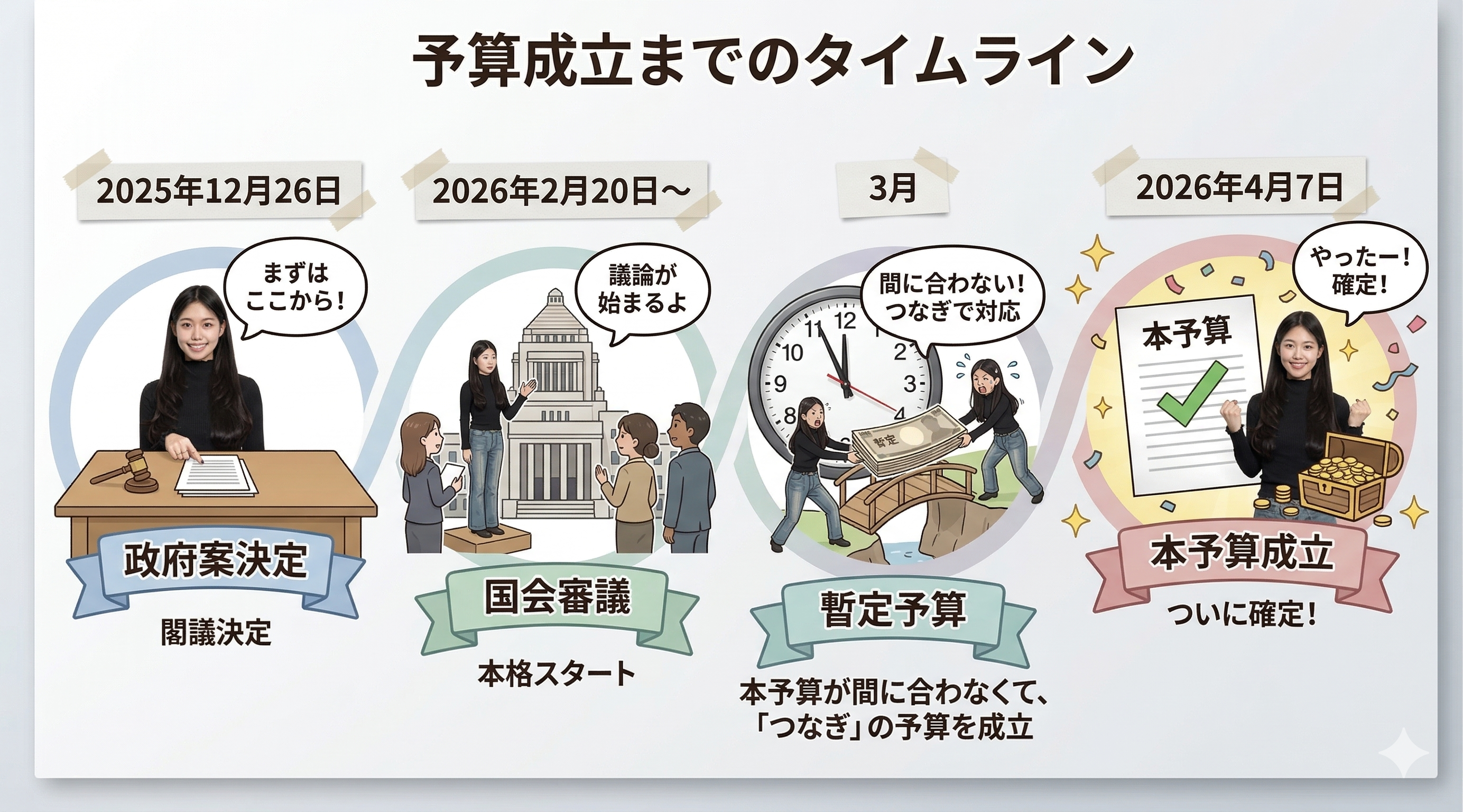 そんな中、今日の日経新聞を読んでたら、うちらの生活にガチで関係あるニュースを見つけちゃったの。それが、参院予算委員会集中審議と2026年度予算(令和8年度予算)の成立!