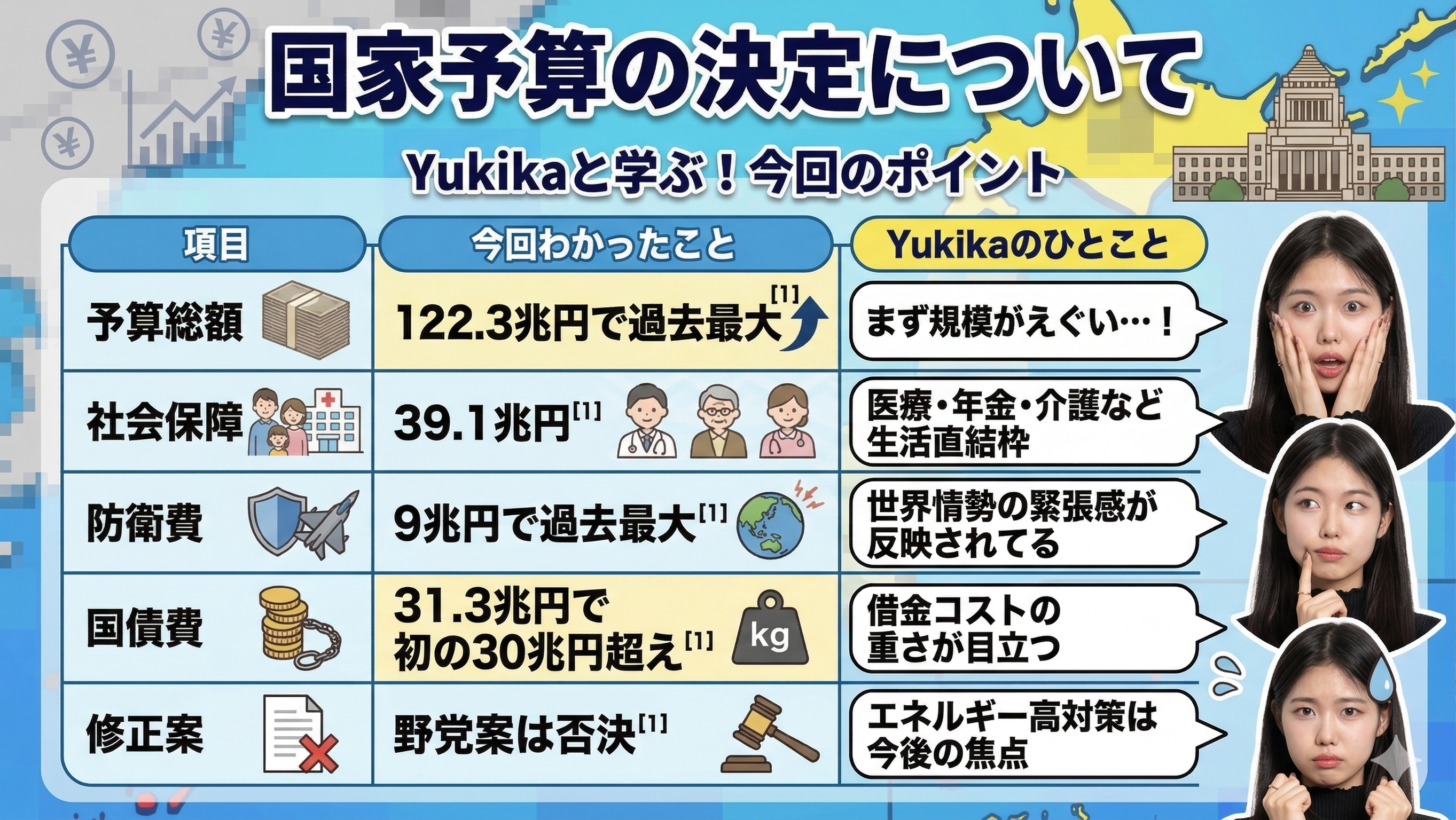 野党側からは「エネルギー高対策が足りない!」って修正案も出たけど、最終的には政府案どおりに決まったよ。 「予算成立=全部解決!」じゃなくて、ここからどう使われるかが本番だね!