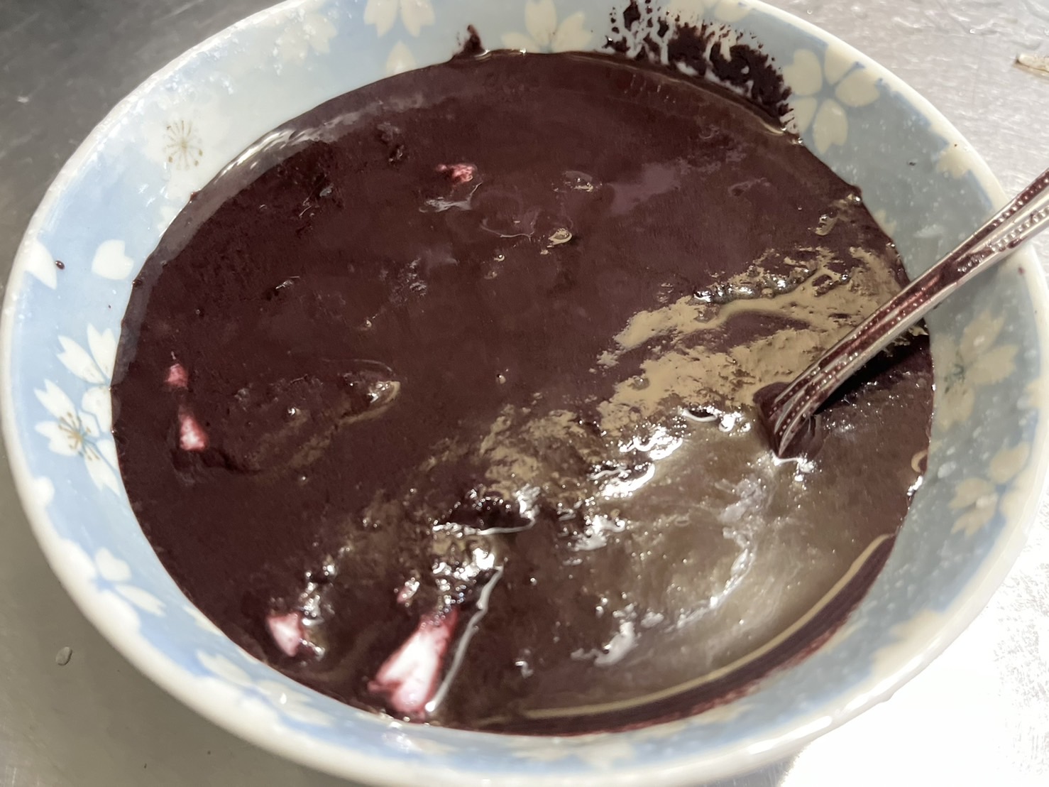 2.3分程度ほど冷凍アサイーが溶けるのを待ってから、マイグラを混ぜ合わせるよ!