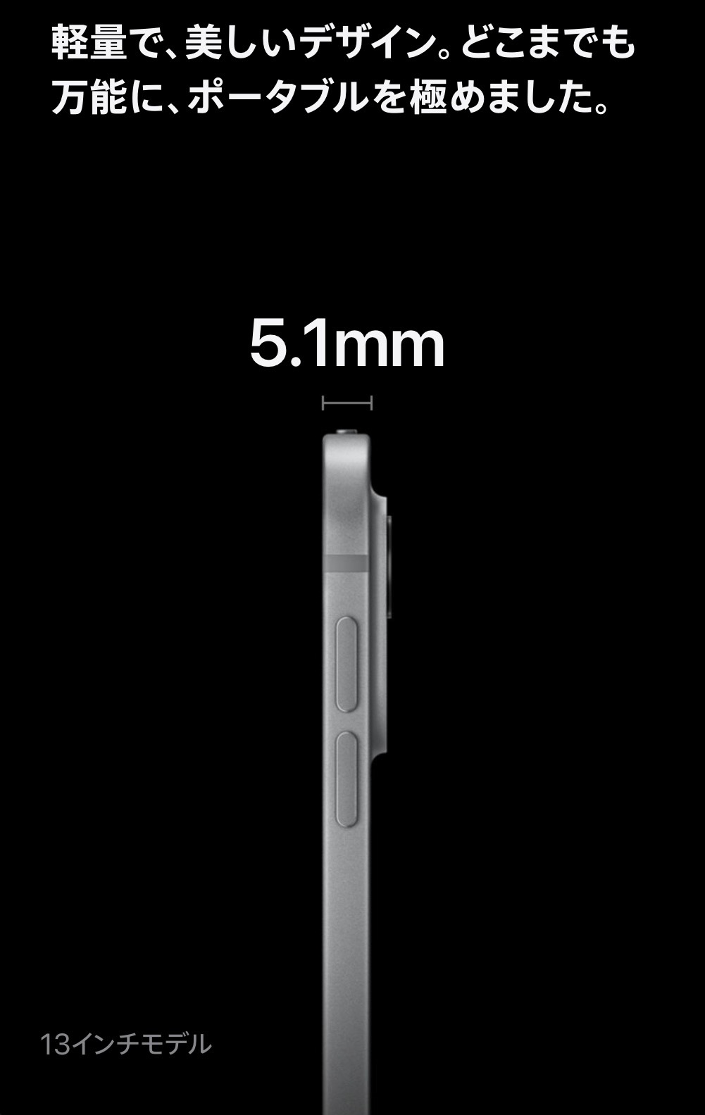 どちらも驚くほど薄く、13インチモデルはなんと5.1mmとiPhone Airと同じくらい衝撃的な薄さ😳M4チップが搭載された前世代より約130gも軽いよ!