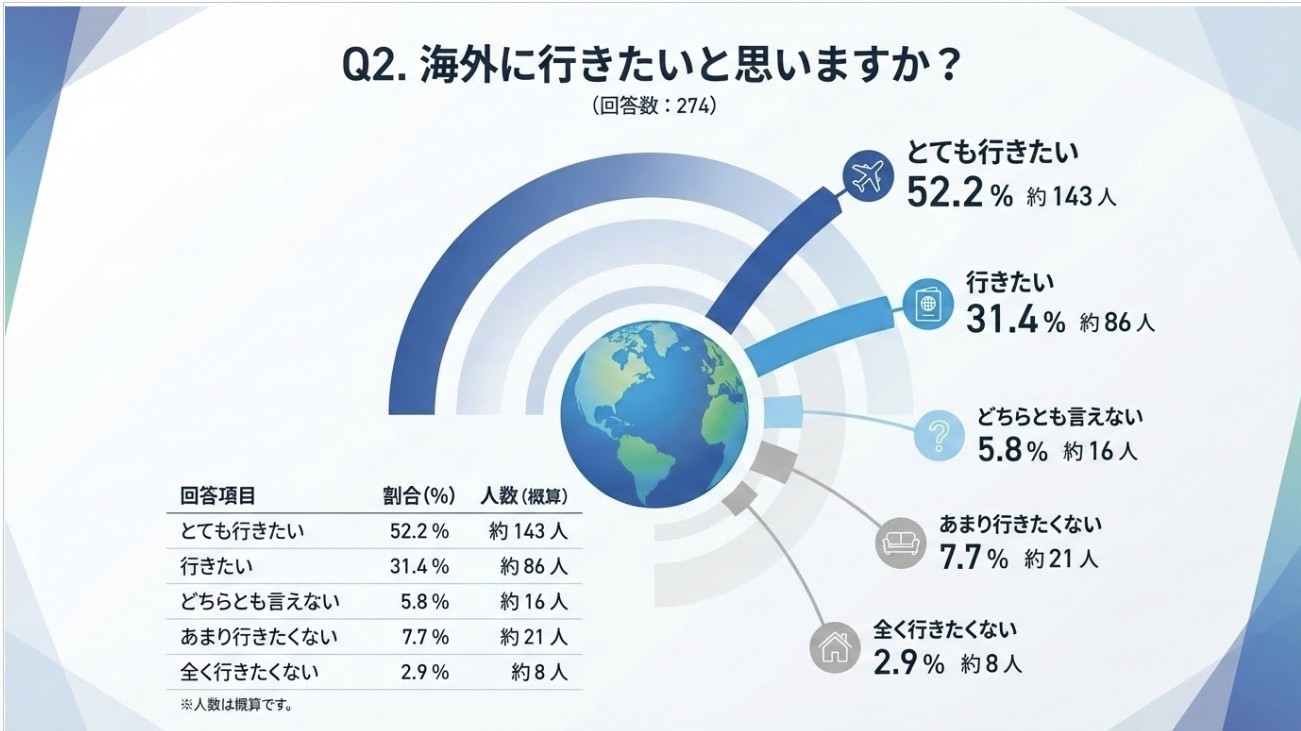 ➡ 合計83.6%が前向き! ほぼ全員が海外に興味アリ✨
