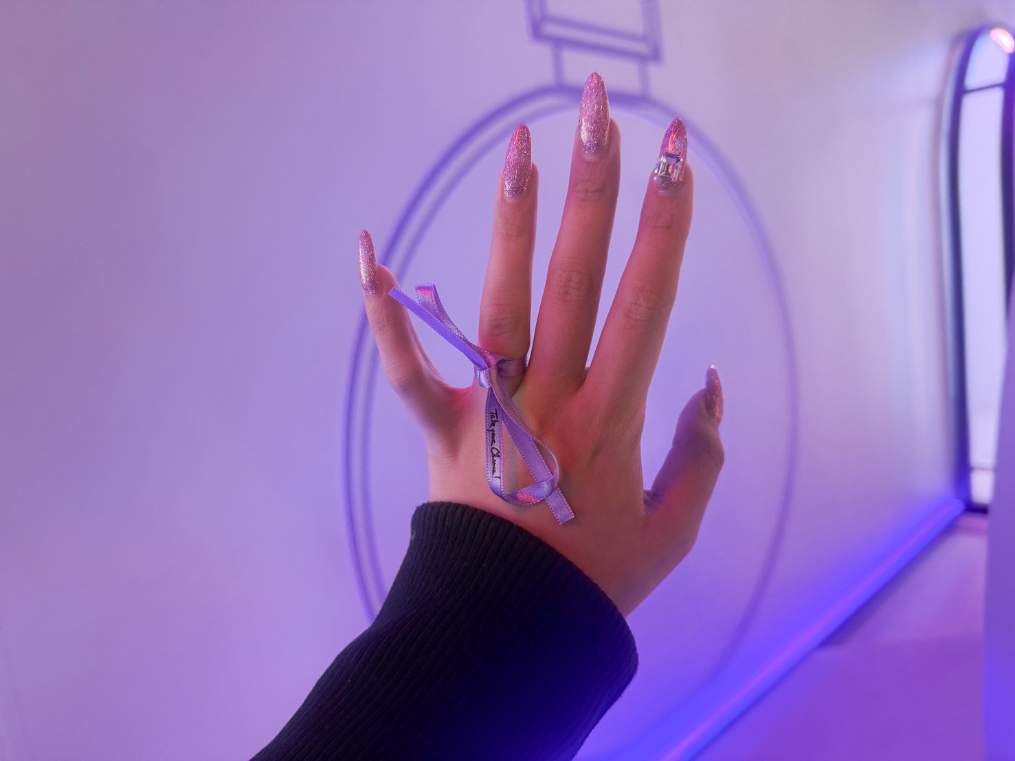 そして、LINEの画面を見せると、「Take your chance」と書かれた紫色のリボンを渡してもらえるよ!好きなところにつけてね♡とのことだったので、私は指に👌🏻💓