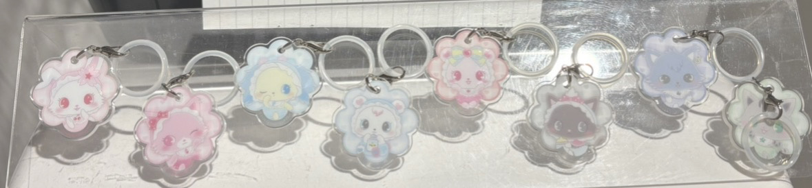 グッズはアクリルスタンド、アクリルキーホルダー、ハンドタオル、エコバッグ、ダイカットステッカー、ランダムマット缶バッジ、ランダム4CUTカードがあるよ〜♡