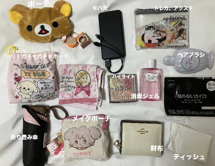 メイクポーチ、ハンカチ、モバ充、イヤホン、ガチャガチャポーチ、財布、ハンドクリーム、カイロ、ブラシ、ハンドジェル、ハイライト、折り畳み、推し活ポーチ