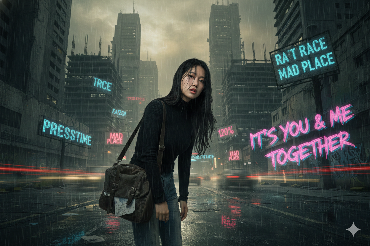 “We live in a crazy world, caught up in a rat race” (うちら、超クレイジーな世界で、終わりのない出世競争に巻き込まれてる) “Concrete jungle life is sometimes a mad place” (コンクリートジャングルでの生活は、時々頭がおかしくなりそうな場所だよね)